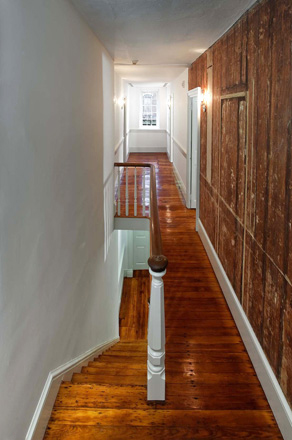View, 2nd floor hall Published June 4, 2013 at 292 × 440 Hall was opened to the street. Board wall (right) displays remnants of old paint and wallpaper © 2008 Jack Ramsdale