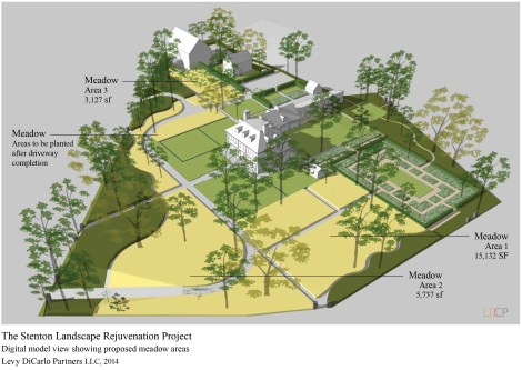 In 2015 Stenton was the recipient of the Garden Club of America’s Founders Fund Award which funded the first and largest part of the urban meadow. LDCP worked with Larry Weaner Landscape Associates to design a meadow specific to the site conditions. Much of the area is moist and lies below mature shade trees, and so was planted with custom mixes of native sedges. Areas on the sides of the mansion that were originally walled courts were planted with low-growing fescues. Before the meadow was seeded, a new driveway (in an historically inspired alignment) was installed. This allows an approach with a view to the mansion set within the meadow.